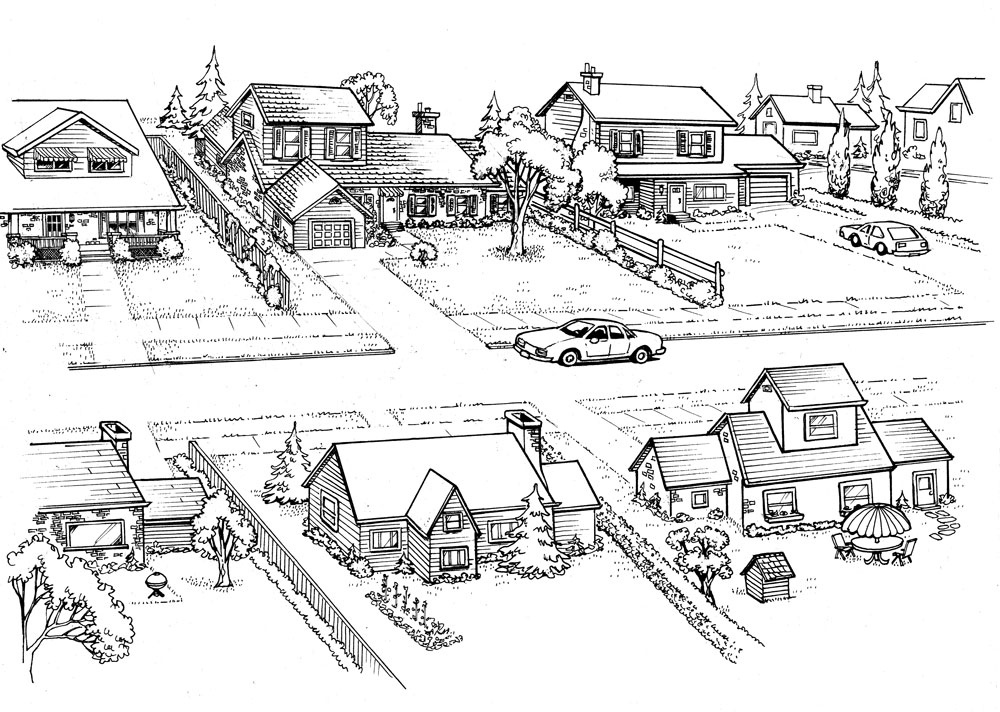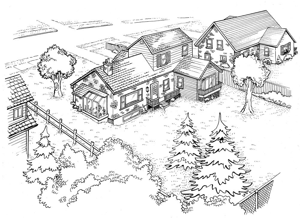 When I designed the Patterson house, I had my old house in Dundas, Ontario, in mind. The front yard, driveway, lawn and front entrance were similar. The house backed onto a ravine just like the Pattersons’ house. I copied the shuttered windows, the garage, and the brick exterior. To some degree, the house I drew was quite recognizable.