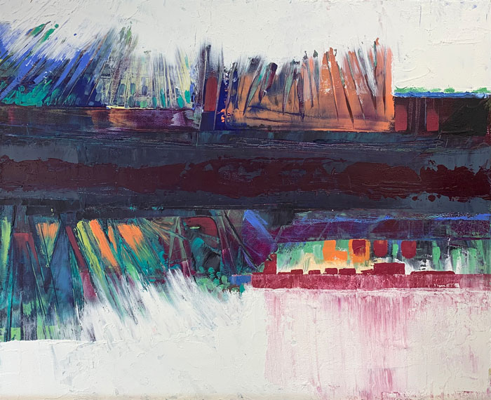 Two of the abstracts are oil and cold wax. The one that looks like a desert with mountains in the background is acrylic. To begin this one, I used gesso and mop cotton, which I pulled like wet spaghetti across the canvas. This was to keep me from making a cartoon landscape; I wanted to do an abstract. Unfortunately, acrylics are what I'm used to, so this painting went from abstract to this desert-looking scene because I overworked it. I played around with it too much. Oil and cold wax is like working with creamy icing, which you spread onto a hard surface using palette knives or squeegees. This is a real change for me. I think it has forced me to work in an abstract style because it takes a while for the surface to dry, and I can't use small brushes. Over the course of the pandemic, painting has kept me busy, happy and sane!