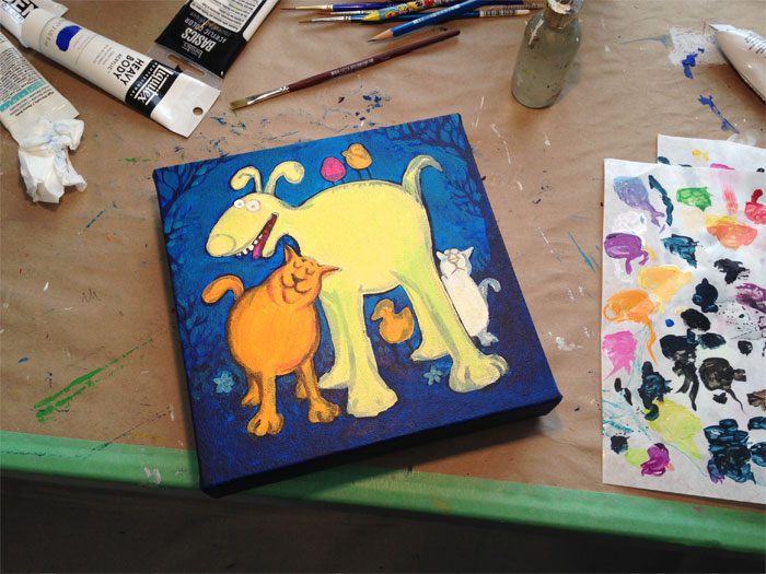 Just before we left North Bay, Ontario, I saw a sale on tiny canvases at a local art/craft shop and thought I'd take advantage. You never know when you'll need a 4X4" canvas, so I bought a bunch of them—I have friends who use them to try out new materials. I thought I'd putter about with cartoon animals in COLOUR, for a change, and these looked like a perfect size. What you'll see here are some fast experiments; some are on wood, others on canvas, and all are done with acrylic paint.