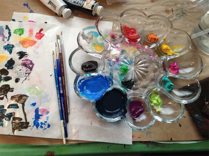 I like to use glass egg trays when I paint. The colours are kept separate. I can mix on the centre of the glass or on disposable paper mixing sheets. I use a laundry sprayer to keep the paint moist as I use it, then I cover the tray with light, plastic shower caps so nothing dries out for the next day's work. These can be found at your dollar store.