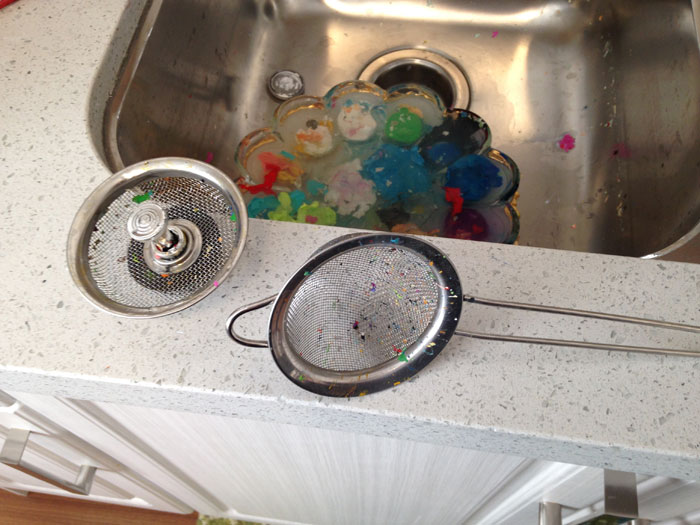 What's great about a glass palette is that acrylic paint washes right off leaving the glass completely clean—no contamination when you do the next job. Let the paint dry hard, then soak the dish in hot water. The paint will pop right off. Keep in mind that this stuff will clog your drains, so I scoop what I can out of the sink with a small strainer, then use a straining cup in the drain when I let the water out.