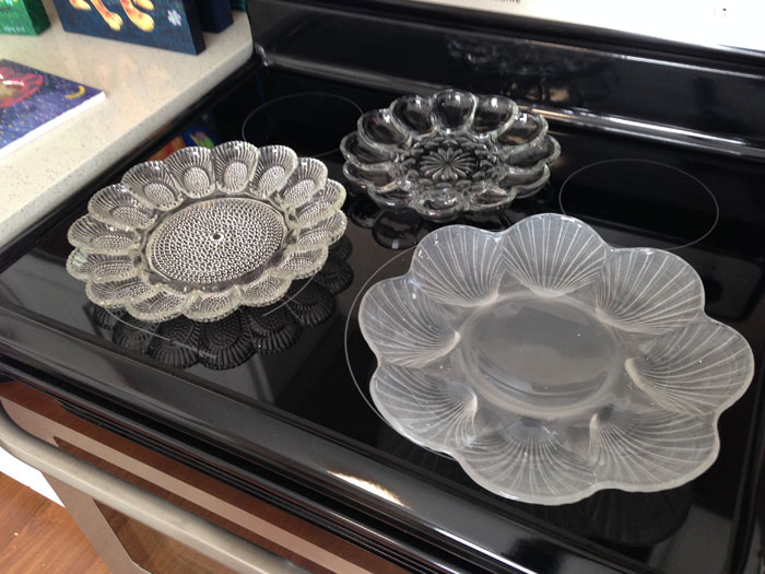 You can sometimes find these "devilled egg" trays at second hand stores. Buy all you can find because they are getting harder and harder to find! I have about 8—all in varying sizes; some with "gold" edges...all glass. Larger dishes with compartments are also useful, so go on a hunt for them if you like to work in acrylic!