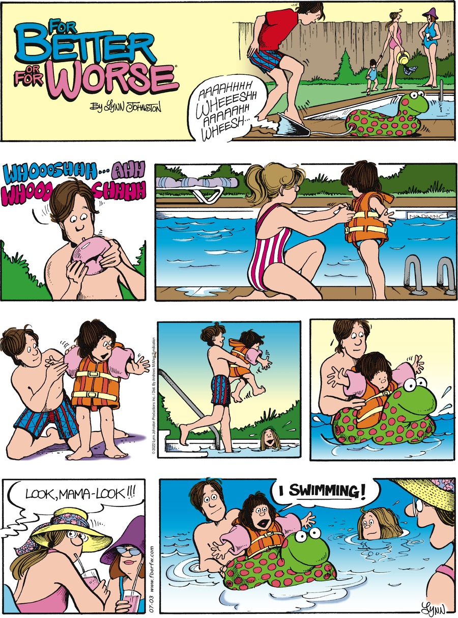 Lynn's Comments: This strip was done for a friend whose little son was so afraid of the water that he had to have all the flotation devices available before he'd go into the pool. He had the inflated arm rings, a life jacket, and when he could, he'd squeeze into an inflatable "doughnut" as well. The funny thing is, this young man is now a deep sea diver who specializes in the inspection and maintenance of underwater structures. Posts, moorings, rigs and sea walls are all part of his underwater work—quite a change from the boy who was afraid of the water! Bourton has also become a clean sea advocate. He donates many hours of his time to finding and removing "ghost nets" from British Columbia's coastal waterways. He and the others who are cleaning up our oceans and beaches are unsung heroes. The next generation is a great one!
