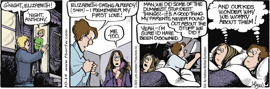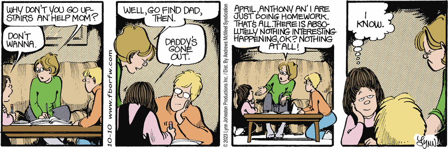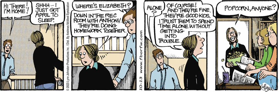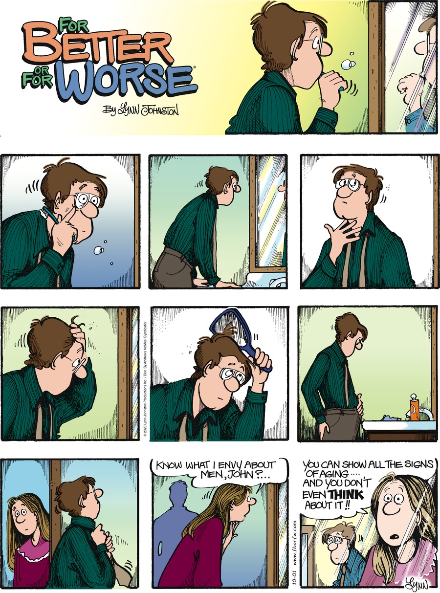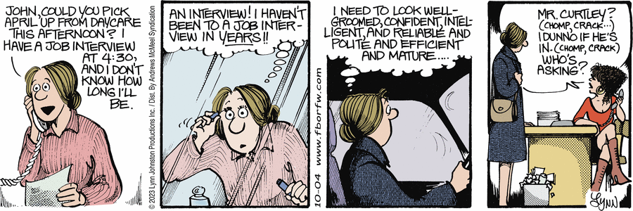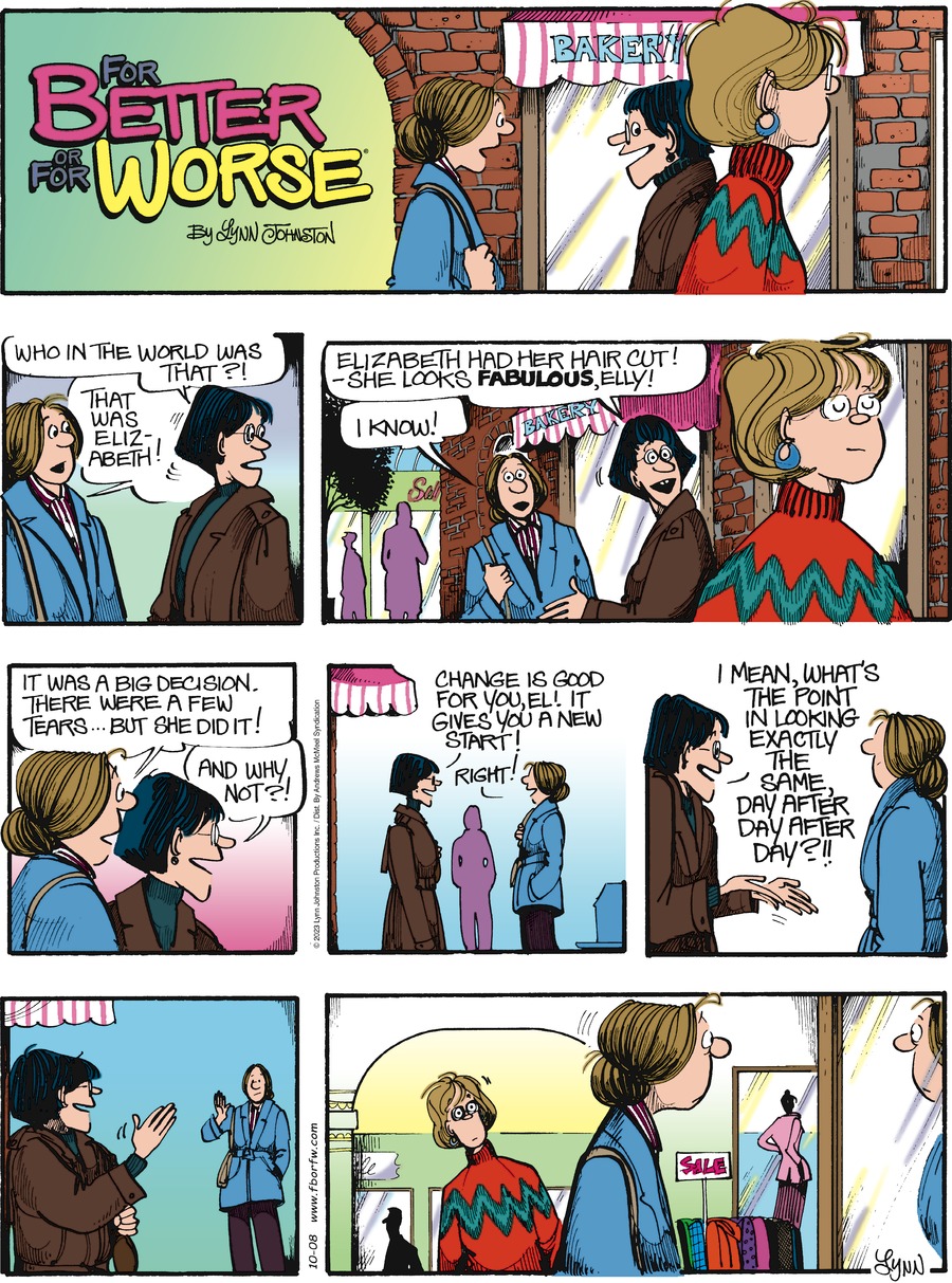 Lynn's Comments: I did this strip to address the readers who insisted I change Elly’s hairstyle. As one of the main characters in the strip, I felt I had to keep her looking relatively the same. Over the years, she sported a pony tail, a bun, and at one time, I "gave" her a perm. Still, the part-in-the-middle-and-tied -back-look was her signature and I didn't want to alter it. The frump-look was firm. This strip let the critics know that I was aware of their hatred for the hairstyle...but I wasn't about to change it!