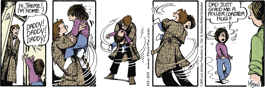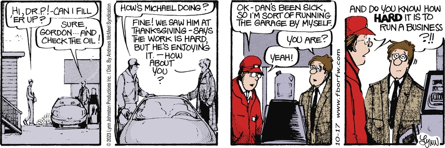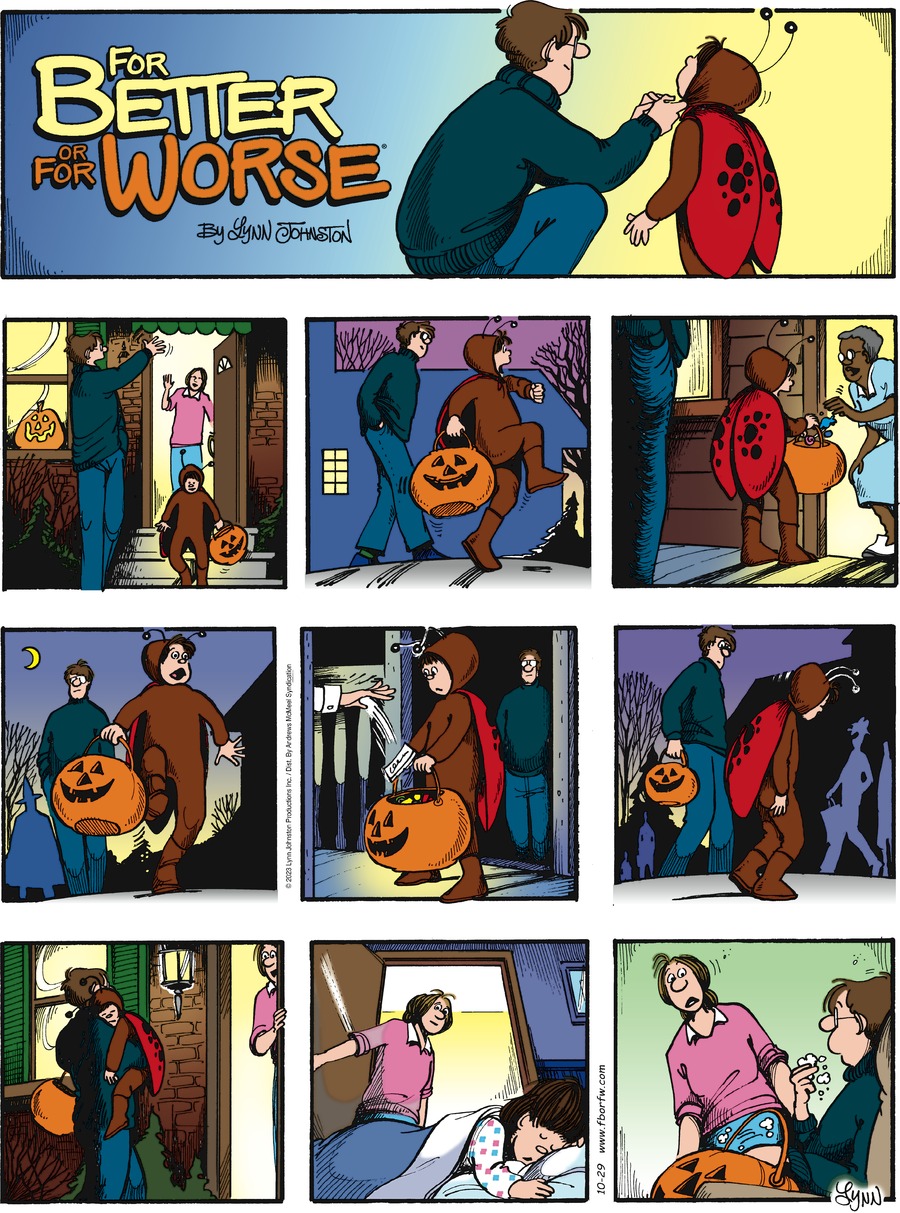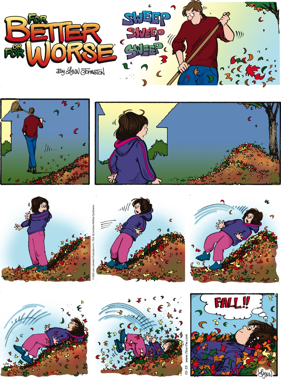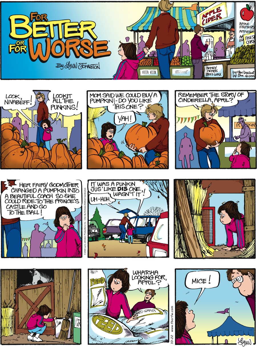 Lynn's Comments: One of the many things about Ontario that I miss is the fall harvest. Along with the spectacular fall colours were the outdoor markets with their piles of pumpkins, crates of apples, fresh veg and homemade items of all kinds. Getting the Halloween pumpkin meant a long ride in the country to a big family farm where we'd buy produce and pumpkins, ride the hay wagon, and have coffee with friends. A signature pastry the family sold from their kitchen was a raspberry turnover to die for! You haven't tasted heaven until you’ve had one of these. Reading this Sunday strip brings back all those wonderful memories.