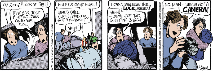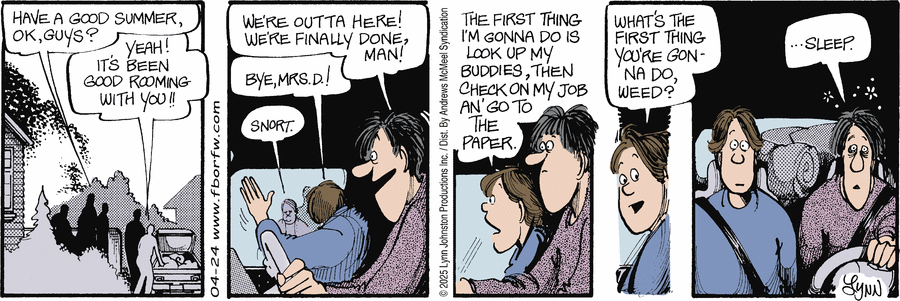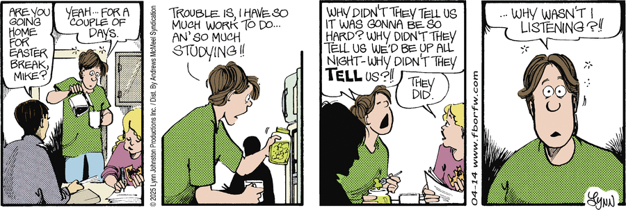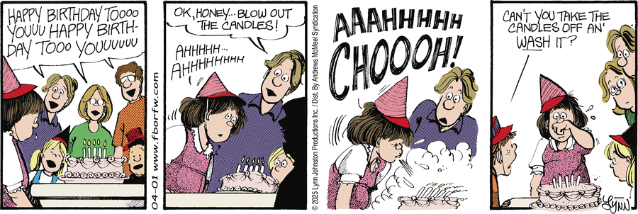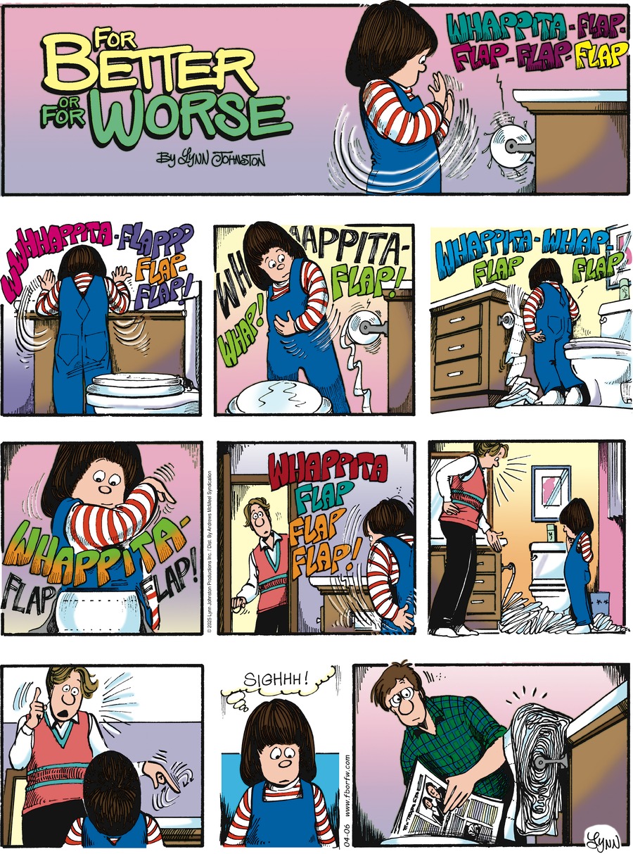 Lynn's Comments: Readers criticized April’s “kidspeak” and told me to make her use proper English. I thought it would detract from a child’s charming way of learning the language. As long as my editors were OK with the content of the strip, I left it alone. One can suffer from too much advice!